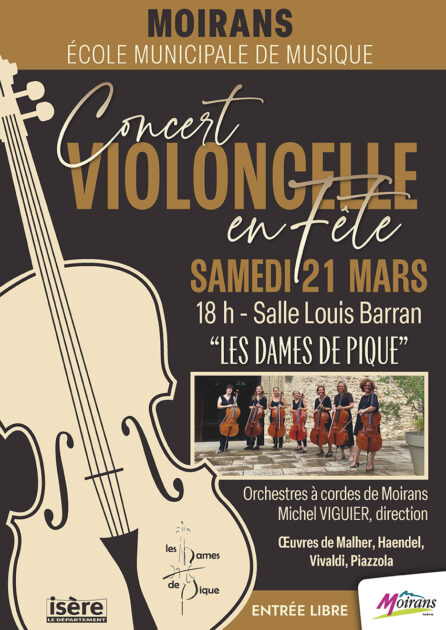 Le concert débutera par l’orchestre à cordes de Moirans qui interprètera la « Saint Paul’s suite », de Gustave Holst. L’ensemble invité rejoindra ensuite l’orchestre pour interpréter le 3e mouvement de la symphonie « Titan », de Gustave Malher. Enfin, les 7 violoncellistes des « Dames de Pique » proposeront un voyage musical varié allant du XVIIe au XXIe siècle avec des œuvres de Haëndel, Vivaldi,Piazzolla mais aussi Galliano, Morricone.